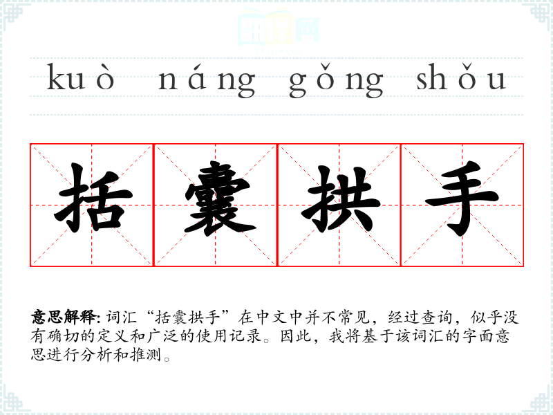 尽管“括囊拱手”不是一个标准词汇,通过对其字面意思的分析,我们可以推测它在特定语境中可能的含义和使用方式。在语言学习和表达中,了解和掌握词汇的多样性和细微差别是非常重要的。