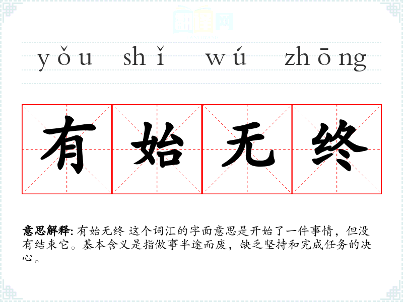 有始无终 这个词汇的字面意思是开始了一件事情,但没有结束它。基本含义是指做事半途而废,缺乏坚持和完成任务的决心。