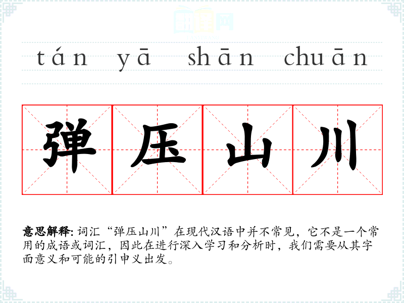词汇“弹压山川”在现代汉语中并不常见,它不是一个常用的成语或词汇,因此在进行深入学*和分析时,我们需要从其字面意义和可能的引申义出发。