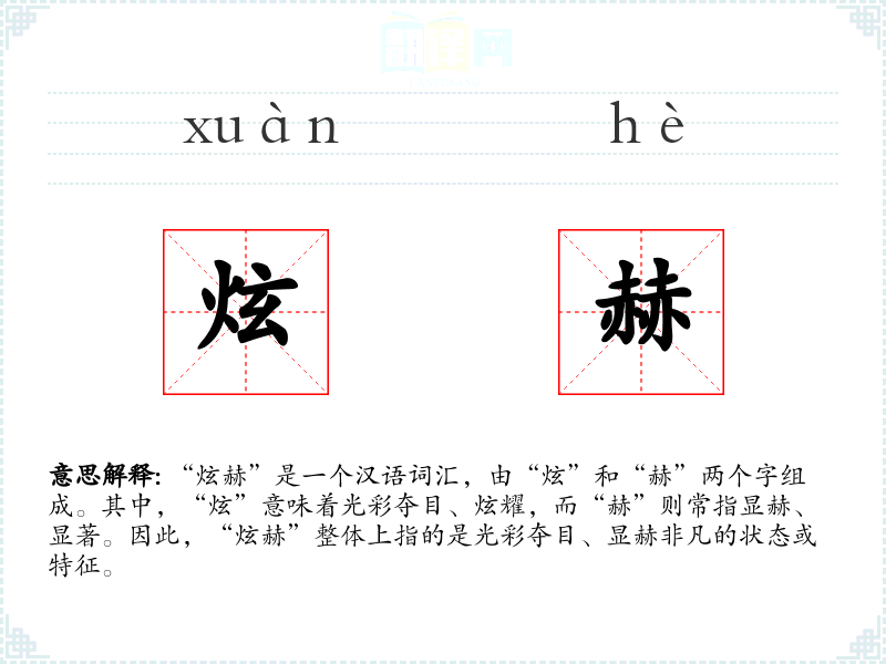 “炫赫”是一个汉语词汇,由“炫”和“赫”两个字组成。其中,“炫”意味着光彩夺目、炫耀,而“赫”则常指显赫、显著。因此,“炫赫”整体上指的是光彩夺目、显赫非凡的状态或特征。