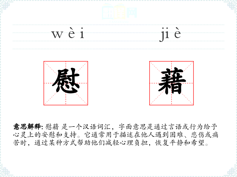 慰藉 是一个汉语词汇,字面意思是通过言语或行为给予心灵上的安慰和支持。它通常用于描述在他人遇到困难、悲伤或痛苦时,通过某种方式帮助他们减轻心理负担,恢复平静和希望。