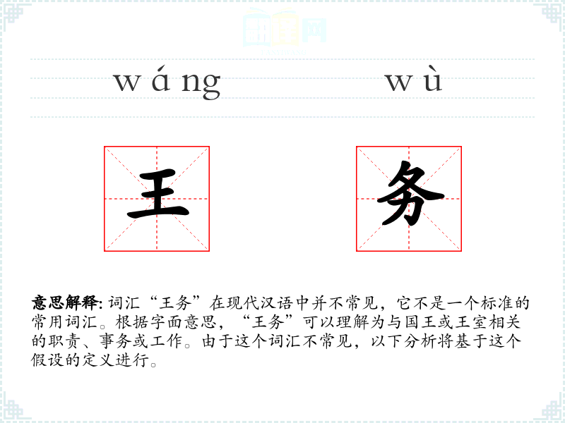 词汇“王务”在现代汉语中并不常见,它不是一个标准的常用词汇。根据字面意思,“王务”可以理解为与国王或王室相关的职责、事务或工作。由于这个词汇不常见,以下分析将基于这个假设的定义进行。