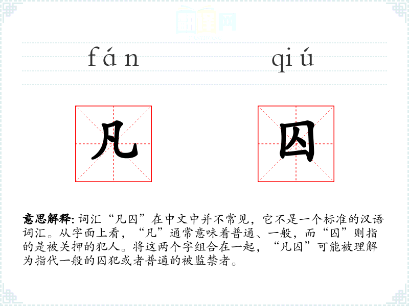 词汇“凡囚”在中文中并不常见,它不是一个标准的汉语词汇。从字面上看,“凡”通常意味着普通、一般,而“囚”则指的是被关押的犯人。将这两个字组合在一起,“凡囚”可能被理解为指代一般的囚犯或者普通的被监禁者。