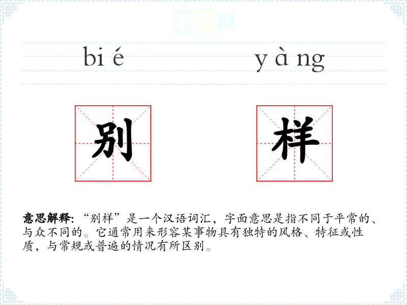 “别样”一词源自汉语,其构成由“别”和“样”组成。在古代汉语中,“别”有分离、不同的意思,“样”指样式、模样。随着语言的发展,“别样”逐渐被用来形容与众不同的事物。