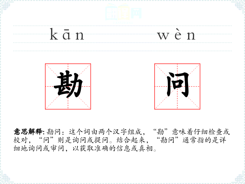 勘问:这个词由两个汉字组成,“勘”意味着仔细检查或校对,“问”则是询问或提问。结合起来,“勘问”通常指的是详细地询问或审问,以获取准确的信息或真相。