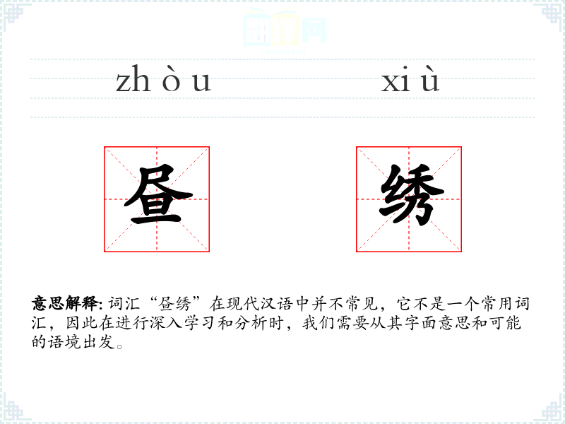 词汇“昼绣”在现代汉语中并不常见,它不是一个常用词汇,因此在进行深入学*和分析时,我们需要从其字面意思和可能的语境出发。