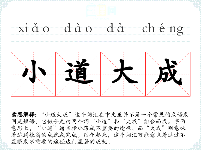 “小道大成”这个词汇虽然不是标准词汇,但它提供了一种表达通过非传统途径取得成功的灵活方式。在鼓励创新和个性化的现代社会中,这样的词汇有助于丰富语言表达,激励人们探索不同的成功路径。