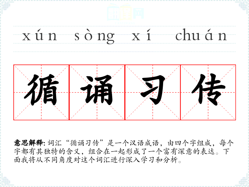 词汇“循诵传”是一个汉语成语,由四个字组成,每个字都有其独特的含义,组合在一起形成了一个富有深意的表达。下面我将从不同角度对这个词汇进行深入学和分析。