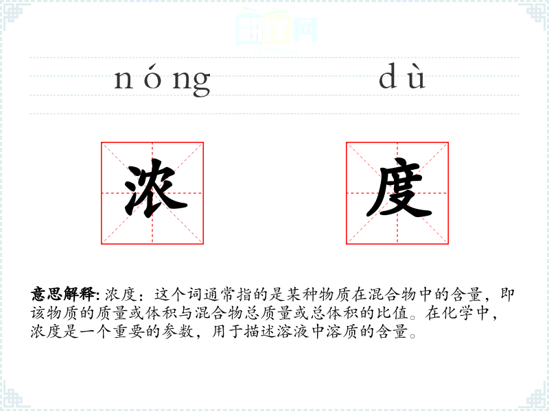 浓度:这个词通常指的是某种物质在混合物中的含量,即该物质的质量或体积与混合物总质量或总体积的比值。在化学中,浓度是一个重要的参数,用于描述溶液中溶质的含量。
