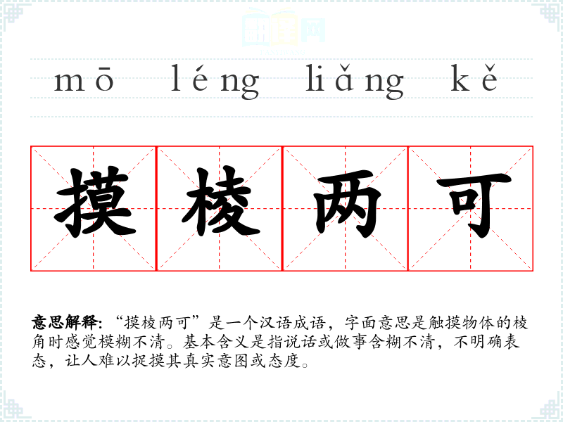 “摸棱两可”是一个汉语成语,字面意思是触摸物体的棱角时感觉模糊不清。基本含义是指说话或做事含糊不清,不明确表态,让人难以捉摸其真实意图或态度。