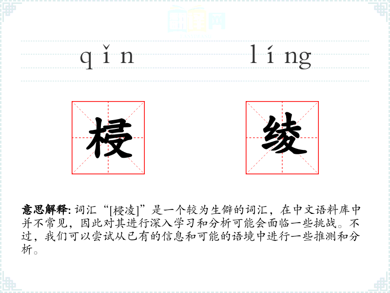 “梫”字在古代汉语中可能指某种植物或木材,而“凌”字有超越、侵犯的含义。这两个字的组合可能是后来形成的词汇,具体的历史演变和在语言中的变化难以考证。