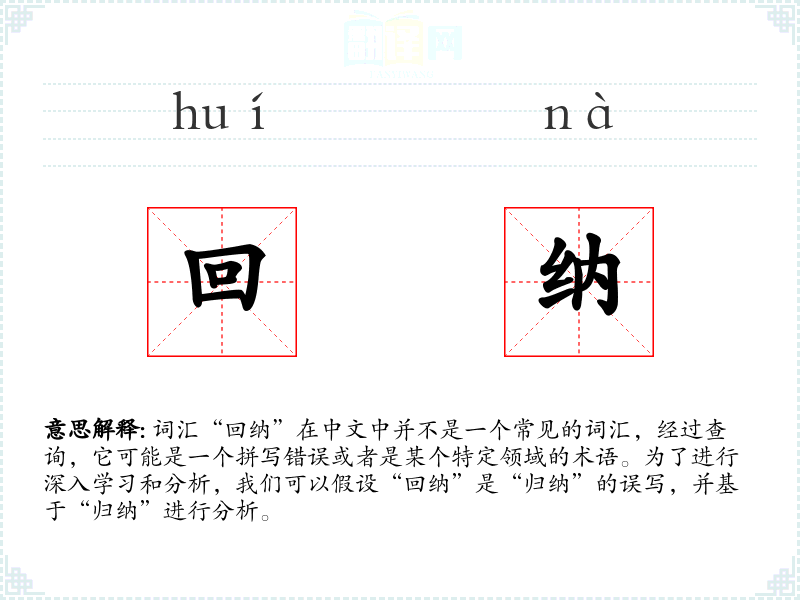 词汇“回纳”在中文中并不是一个常见的词汇,经过查询,它可能是一个拼写错误或者是某个特定领域的术语。为了进行深入学习和分析,我们可以假设“回纳”是“归纳”的误写,并基于“归纳”进行分析。