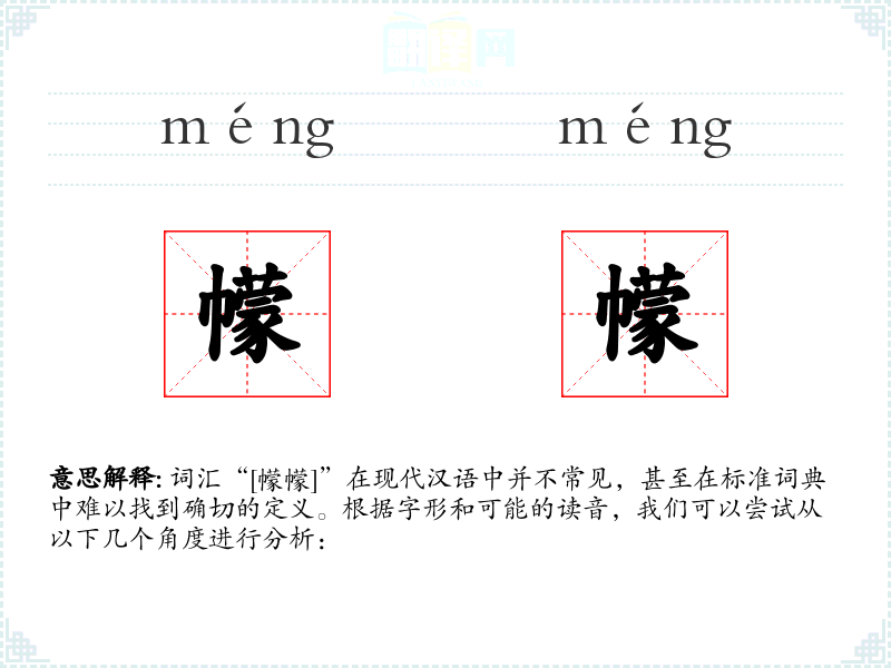 词汇“[幪幪]”在现代汉语中并不常见,甚至在标准词典中难以找到确切的定义。根据字形和可能的读音,我们可以尝试从以下几个角度进行分析: