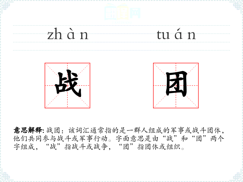战团:该词汇通常指的是一群人组成的军事或战斗团体,他们共同参与战斗或军事行动。字面意思是由“战”和“团”两个字组成,“战”指战斗或战争,“团”指团体或组织。