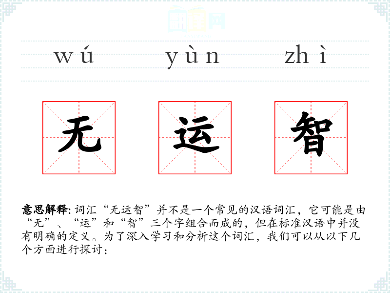 由于“无运智”不是一个标准词汇,我们无法给出确切的字面意思和基本含义。但从字面上理解,“无”可能表示“没有”,“运”可能与“运气”或“运用”有关,“智”则指“智慧”。因此,“无运智”可能意味着“没有运用智慧”或“缺乏智慧的运用”。