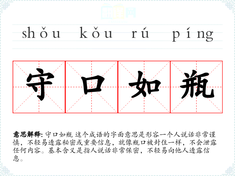 守口如瓶 这个成语的字面意思是形容一个人说话非常谨慎,不轻易透露秘密或重要信息,就像瓶口被封住一样,不会泄露任何内容。基本含义是指人说话非常保密,不轻易向他人透露信息。