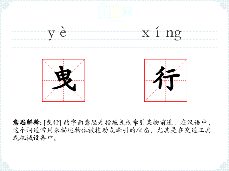 [曳行] 的字面意思是指拖曳或牵引某物前进。在汉语中,这个词通常用来描述物体被拖动或牵引的状态,尤其是在交通工具或机械设备中。