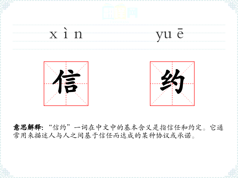 “信约”一词在中文中的基本含义是指信任和约定。它通常用来描述人与人之间基于信任而达成的某种协议或承诺。