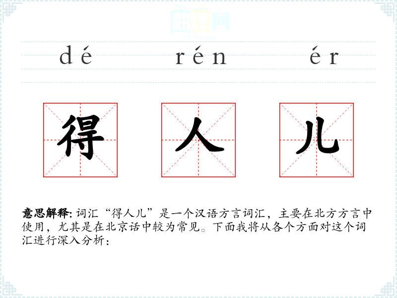 词汇“得人儿”是一个汉语方言词汇,主要在北方方言中使用,尤其是在北京话中较为常见。下面我将从各个方面对这个词汇进行深入分析: