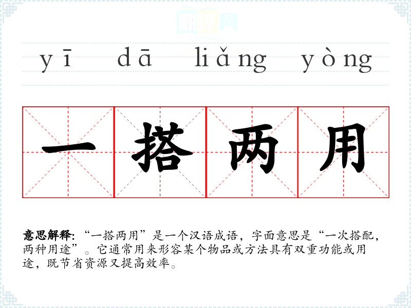 “一搭两用”是一个汉语成语,字面意思是“一次搭配,两种用途”。它通常用来形容某个物品或方法具有双重功能或用途,既节省资源又提高效率。