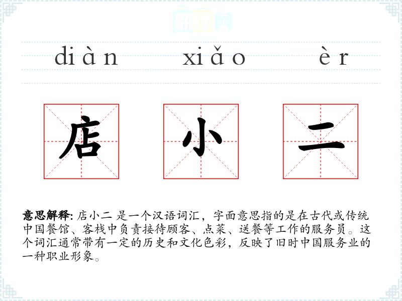 店小二 是一个汉语词汇,字面意思指的是在古代或传统餐馆、客栈中负责接待顾客、点菜、送餐等工作的服务员。这个词汇通常带有一定的历史和文化色彩,反映了旧时服务业的一种职业形象。