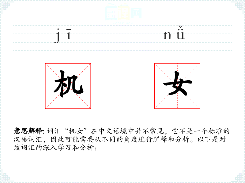 词汇“机女”在中文语境中并不常见,它不是一个标准的汉语词汇,因此可能需要从不同的角度进行解释和分析。以下是对该词汇的深入学习和分析: