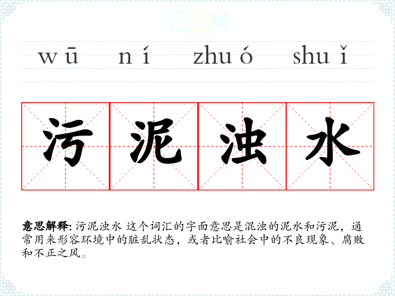 污泥浊水 这个词汇的字面意思是混浊的泥水和污泥,通常用来形容环境中的脏乱状态,或者比喻社会中的不良现象、腐败和不正之风。