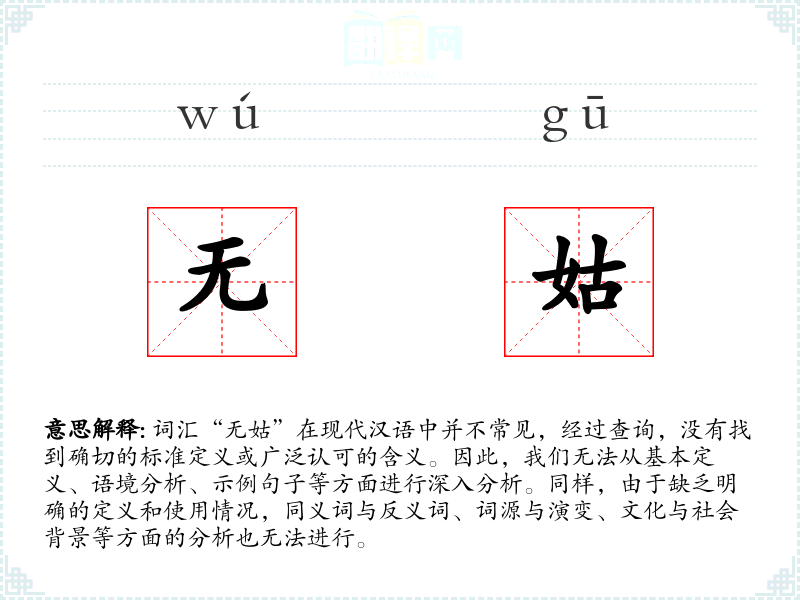 - 反思与总结:由于“无姑”不是一个标准词汇,它的使用和理解可能非常有限。在语言学*和表达中,了解和使用标准词汇更为重要,但探索和理解非常规词汇也能增加语言的丰富性和深度。