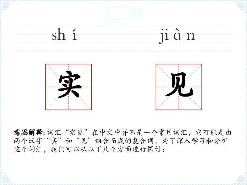 词汇“实见”在中文中并不是一个常用词汇,它可能是由两个汉字“实”和“见”组合而成的复合词。为了深入学*和分析这个词汇,我们可以从以下几个方面进行探讨: