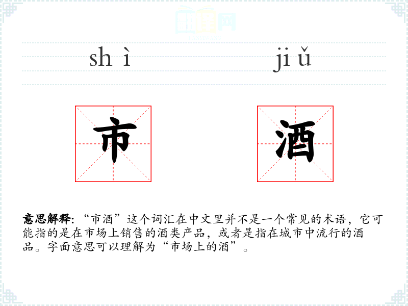 “市酒”这个词汇在中文里并不是一个常见的术语,它可能指的是在市场上销售的酒类产品,或者是指在城市中流行的酒品。字面意思可以理解为“市场上的酒”。