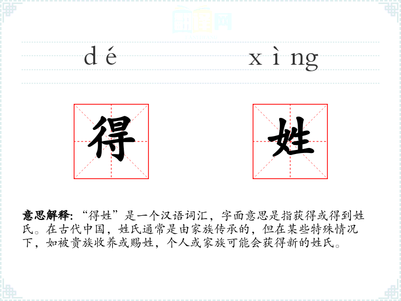 “得姓”是一个汉语词汇,字面意思是指获得或得到姓氏。在古代**,姓氏通常是由家族传承的,但在某些特殊情况下,如被贵族收养或赐姓,个人或家族可能会获得新的姓氏。