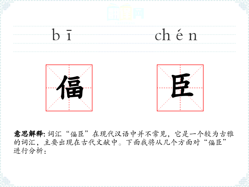 词汇“偪臣”在现代汉语中并不常见,它是一个较为古雅的词汇,主要出现在古代文献中。下面我将从几个方面对“偪臣”进行分析: