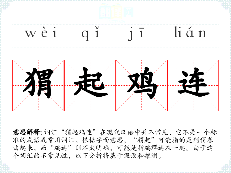 词汇“猬起鸡连”在现代汉语中并不常见,它不是一个标准的成语或常用词汇。根据字面意思,“猬起”可能指的是刺猬卷曲起来,而“鸡连”则不太明确,可能是指鸡群连在一起。由于这个词汇的不常见性,以下分析将基于假设和推测。
