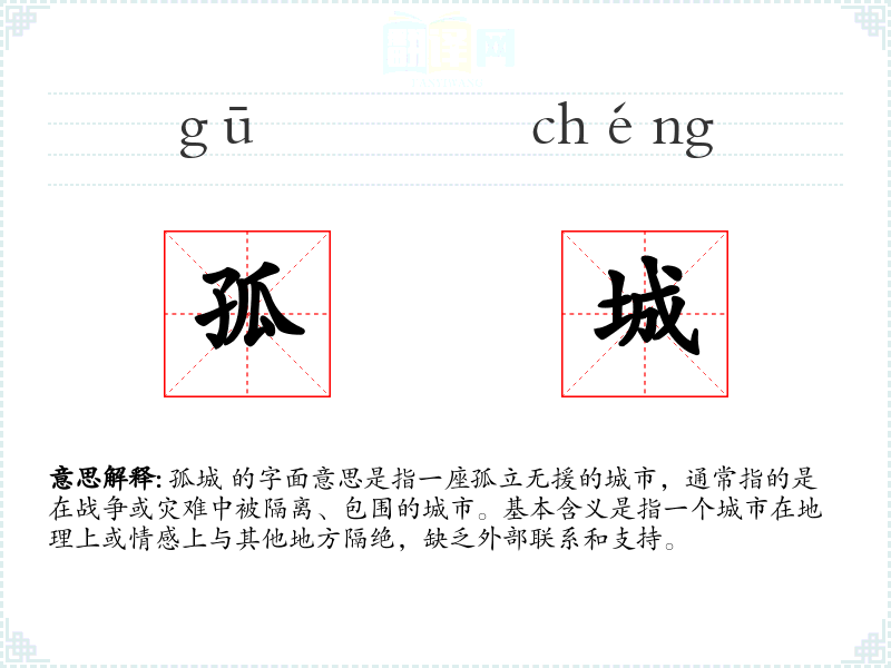 孤城 的字面意思是指一座孤立无援的城市,通常指的是在战争或灾难中被隔离、包围的城市。基本含义是指一个城市在地理上或情感上与其他地方隔绝,缺乏外部联系和支持。