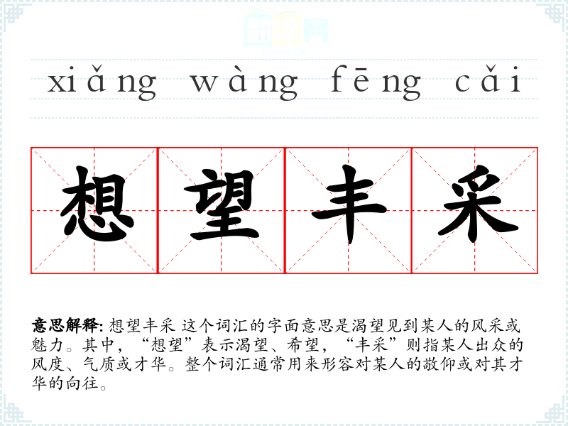 想望丰采 这个词汇的字面意思是渴望见到某人的风采或魅力。其中,“想望”表示渴望、希望,“丰采”则指某人出众的风度、气质或才华。整个词汇通常用来形容对某人的敬仰或对其才华的向往。