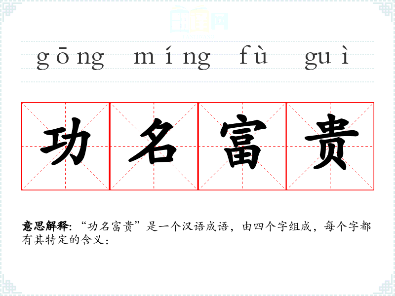 “功名富贵”是一个汉语成语,由四个字组成,每个字都有其特定的含义: