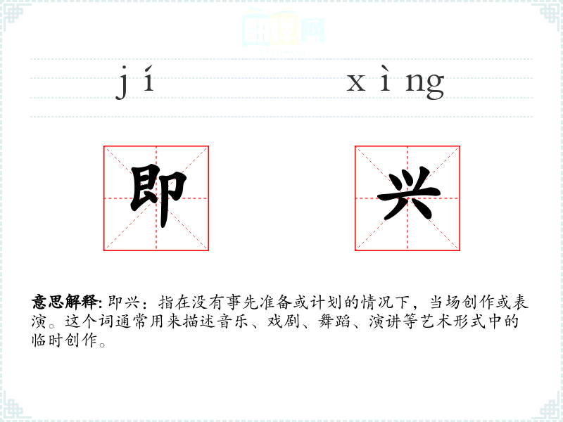 即兴:指在没有事先准备或计划的情况下,当场创作或表演。这个词通常用来描述音乐、戏剧、舞蹈、演讲等艺术形式中的临时创作。