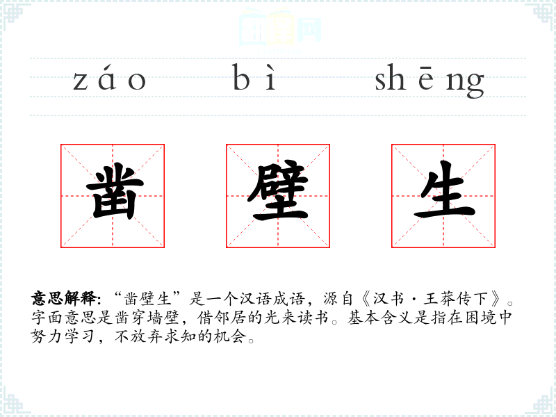 “凿壁生”是一个汉语成语,源自《汉书·王莽传下》。字面意思是凿穿墙壁,借邻居的光来读书。基本含义是指在困境中努力学*,不放弃求知的机会。