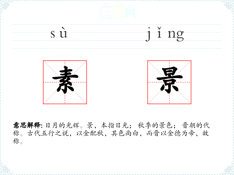 日月的光辉。景,本指日光; 秋季的景色; 晋朝的代称。古代五行之说,以金配秋,其色尚白,而晋以金德为帝,故称。