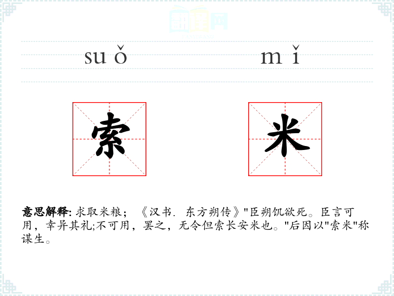 求取米粮; 《汉书.东方朔传》"臣朔饥欲死。臣言可用,幸异其礼;不可用,罢之,无令但索长安米也。"后因以"索米"称谋生。