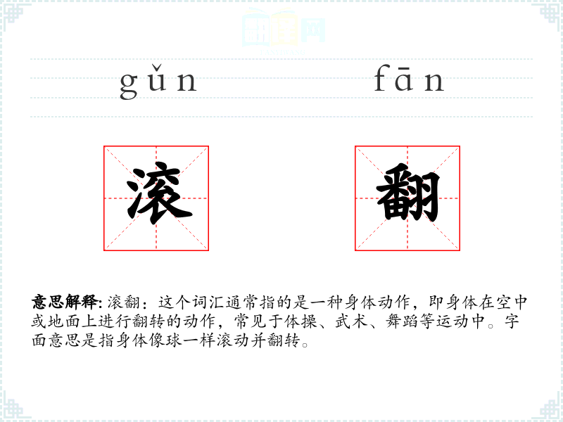滚翻:这个词汇通常指的是一种身体动作,即身体在空中或地面上进行翻转的动作,常见于体操、武术、舞蹈等**中。字面意思是指身体像球一样滚动并翻转。