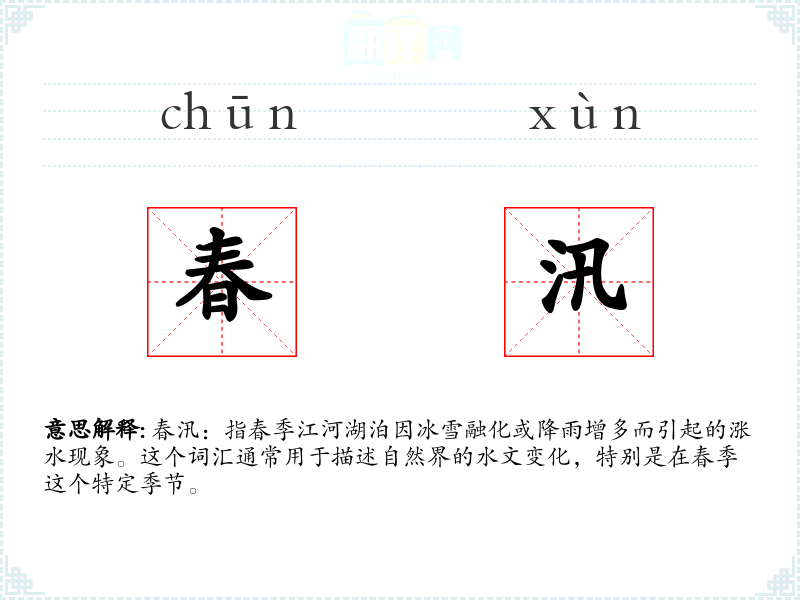 春汛:指春季江河湖泊因冰雪融化或降雨增多而引起的涨水现象。这个词汇通常用于描述自然界的水文变化,特别是在春季这个特定季节。