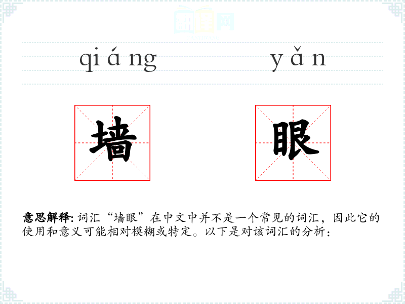 - 反义词:无(由于“墙眼”不是一个常用词汇,反义词可能不适用)