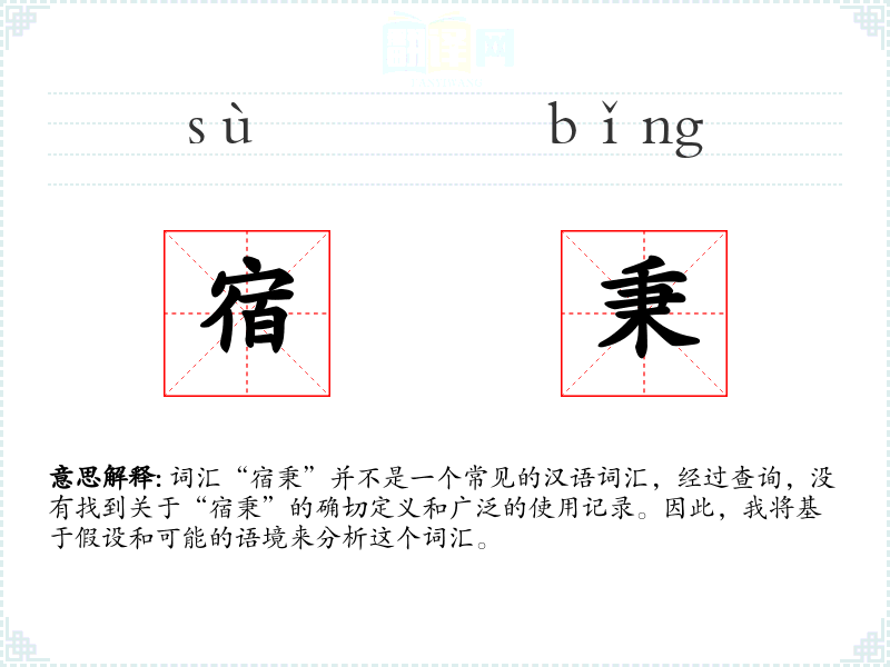 词汇“宿秉”并不是一个常见的汉语词汇,经过查询,没有找到关于“宿秉”的确切定义和广泛的使用记录。因此,我将基于假设和可能的语境来分析这个词汇。