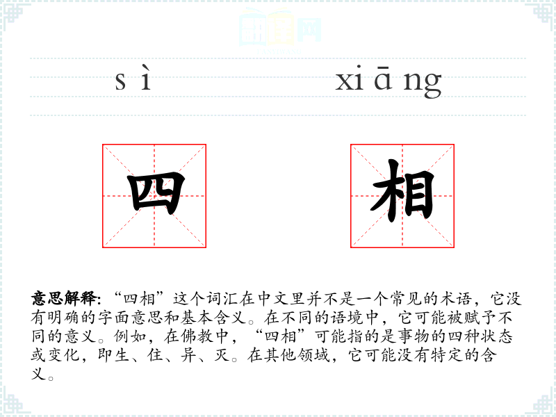 “四相”这个词汇在中文里并不是一个常见的术语,它没有明确的字面意思和基本含义。在不同的语境中,它可能被赋予不同的意义。例如,在**中,“四相”可能指的是事物的四种状态或变化,即生、住、异、灭。在其他领域,它可能没有特定的含义。