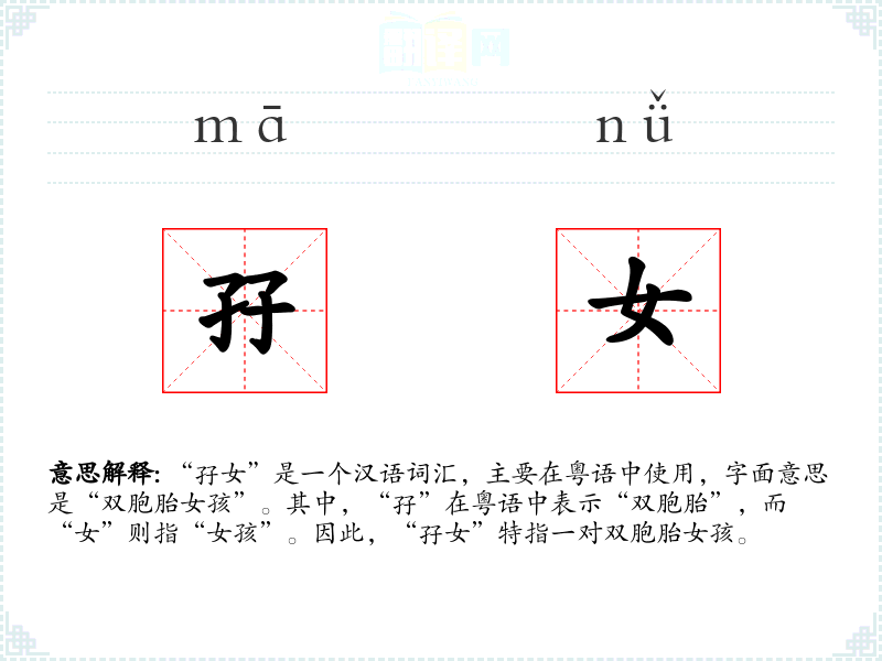 “孖”字在粤语中有着悠久的历史,源自古代汉语,最初可能用来形容成对的事物。随着时间的推移,“孖”逐渐被用来特指双胞胎。而“女”字则是一个基本汉字,表示女性。
