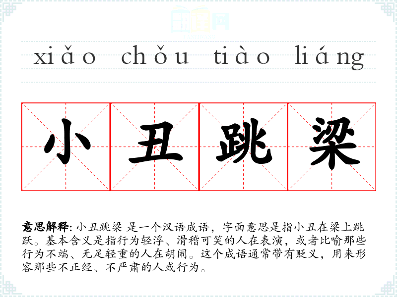 小丑跳梁 是一个汉语成语,字面意思是指小丑在梁上跳跃。基本含义是指行为轻浮、滑稽可笑的人在表演,或者比喻那些行为不端、无足轻重的人在胡闹。这个成语通常带有贬义,用来形容那些不正经、不严肃的人或行为。