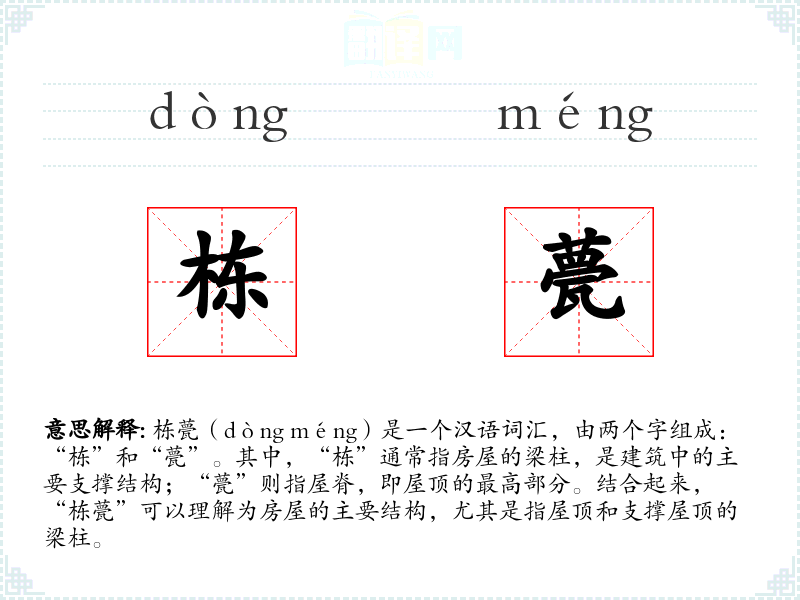 - 反义词:基础、地基(这些词汇与“栋甍”形成对比,前者指建筑的下部支撑,后者指上部结构)