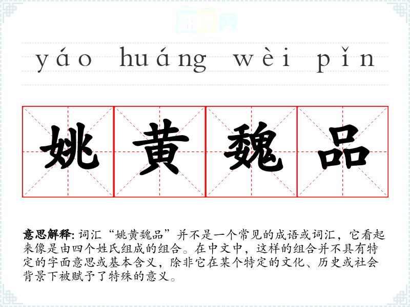 由于“姚黄魏品”不是一个标准的词汇或成语,我们无法给出一个确切的基本定义。它可能是一个特定群体的名称,或者是某个特定场合下创造的词汇。