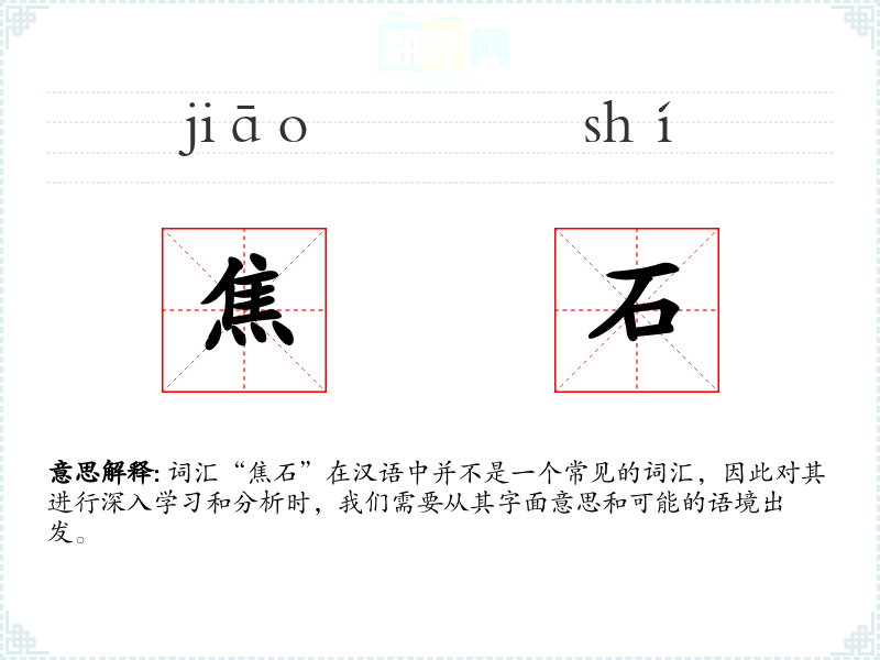 词汇“焦石”在汉语中并不是一个常见的词汇,因此对其进行深入学习和分析时,我们需要从其字面意思和可能的语境出发。